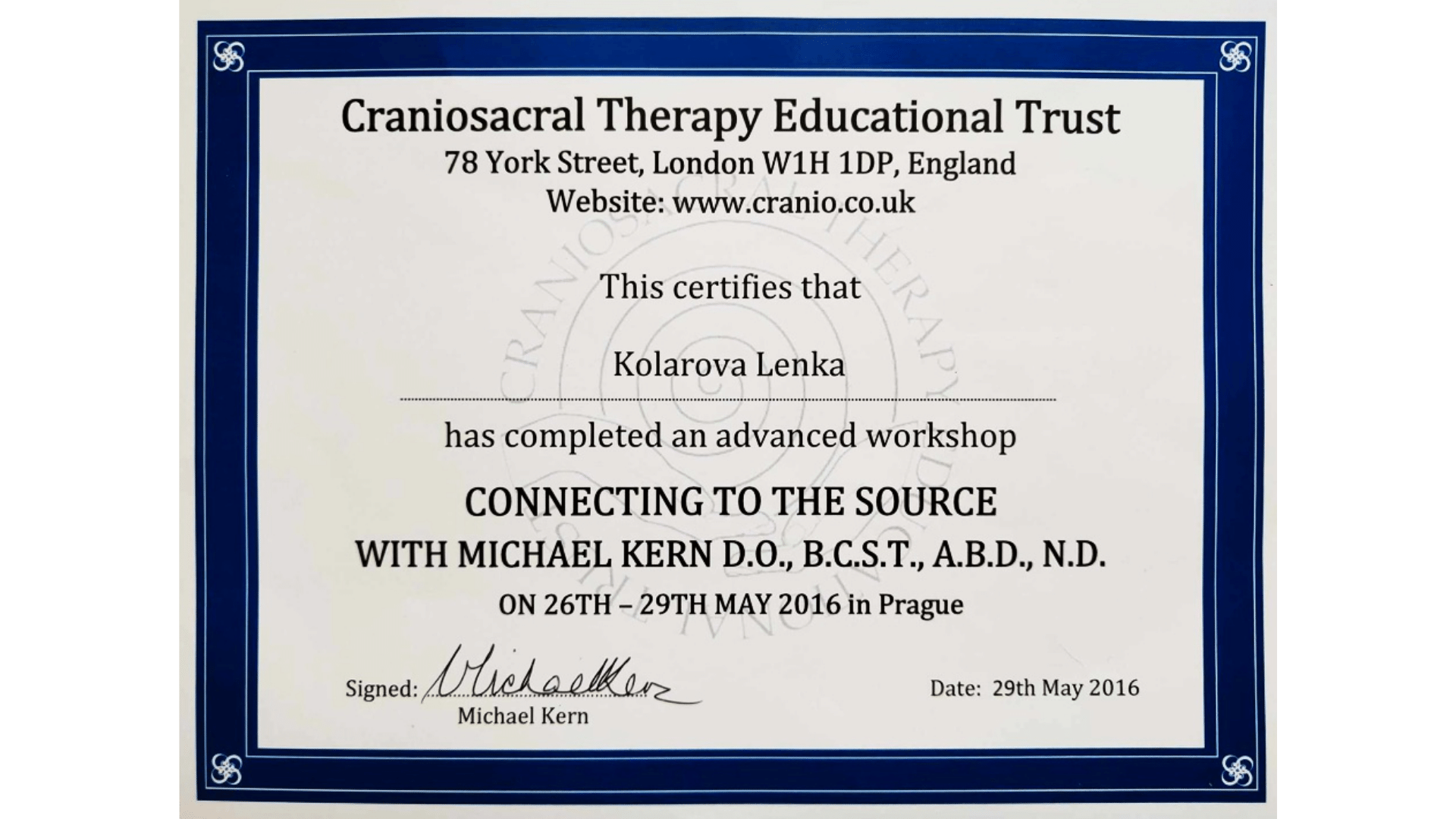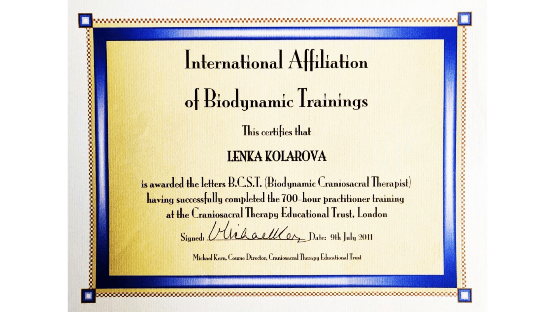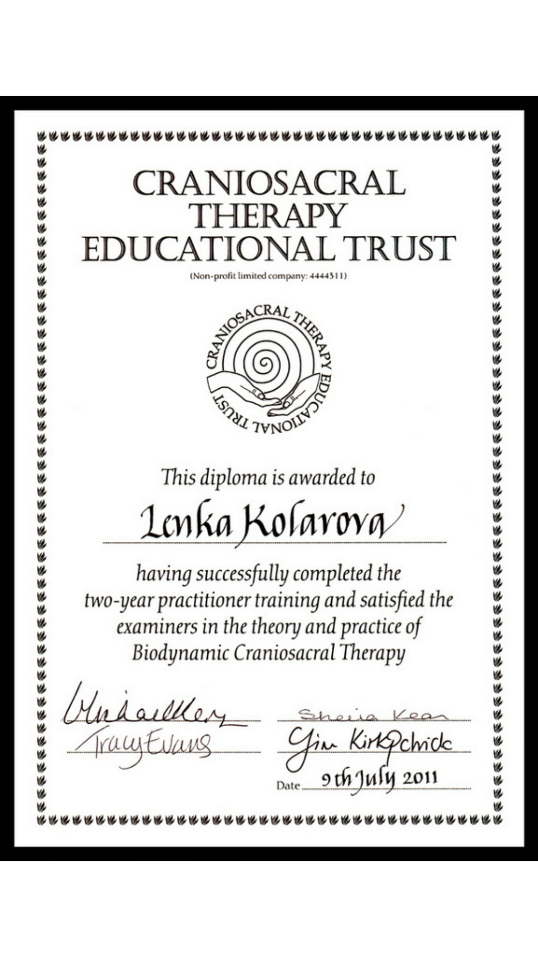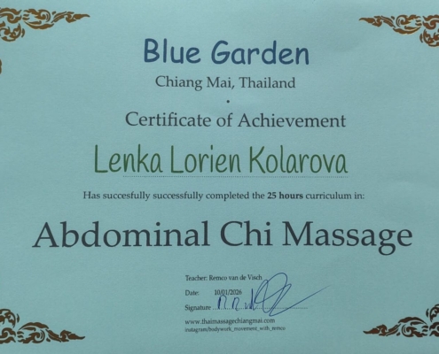 Vzdělání jsem získala na britské škole biodynamické kraniosakrální terapie, kde mě vedli zkušení učitelé a osteopaté. Během dvou let jsem se naučila vnímat tělo, jeho rytmy a podporovat přirozené samouzdravovací procesy.